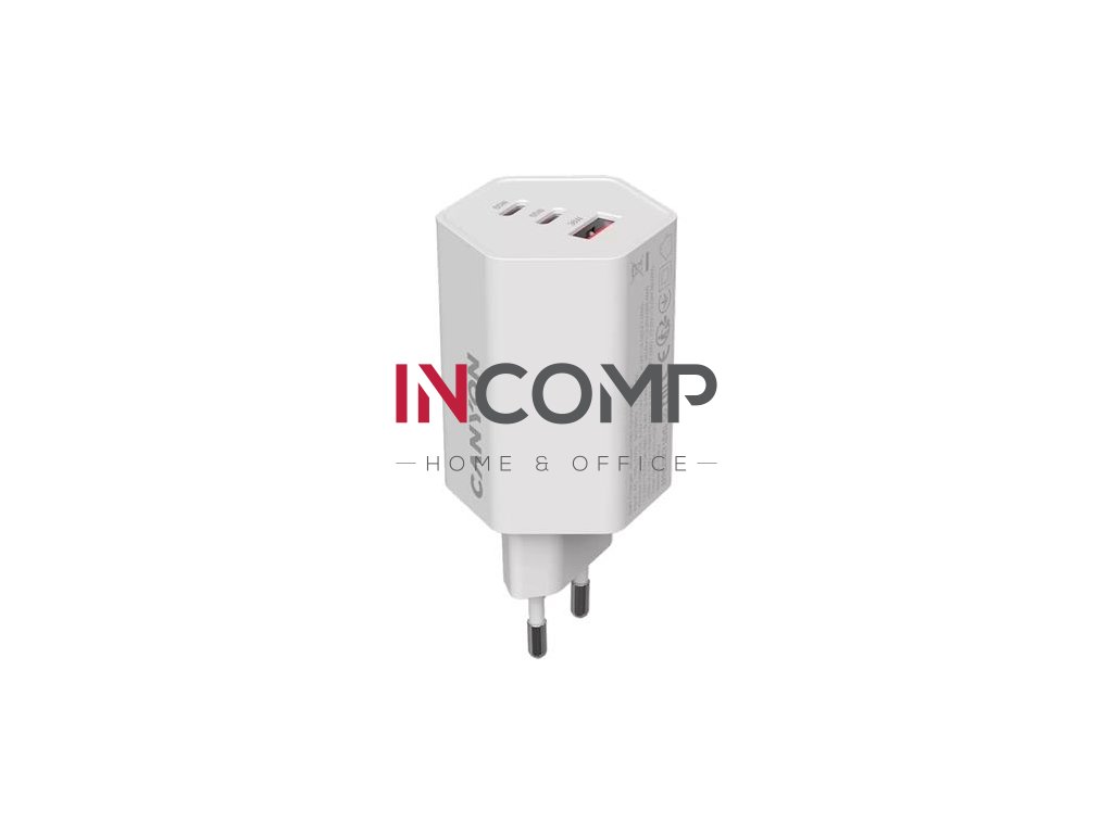 Sieťová nabíjačka, 1×USB-A, 2×USB-C, 65 W, CANYON „Hexagon 65“, biela