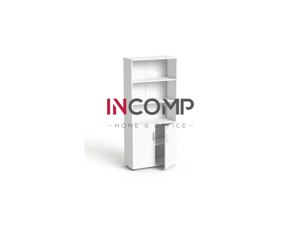 Kombinovaná skriňa, výška na 5 zakladačov, s dverovou a otvorenou policovou časťou.