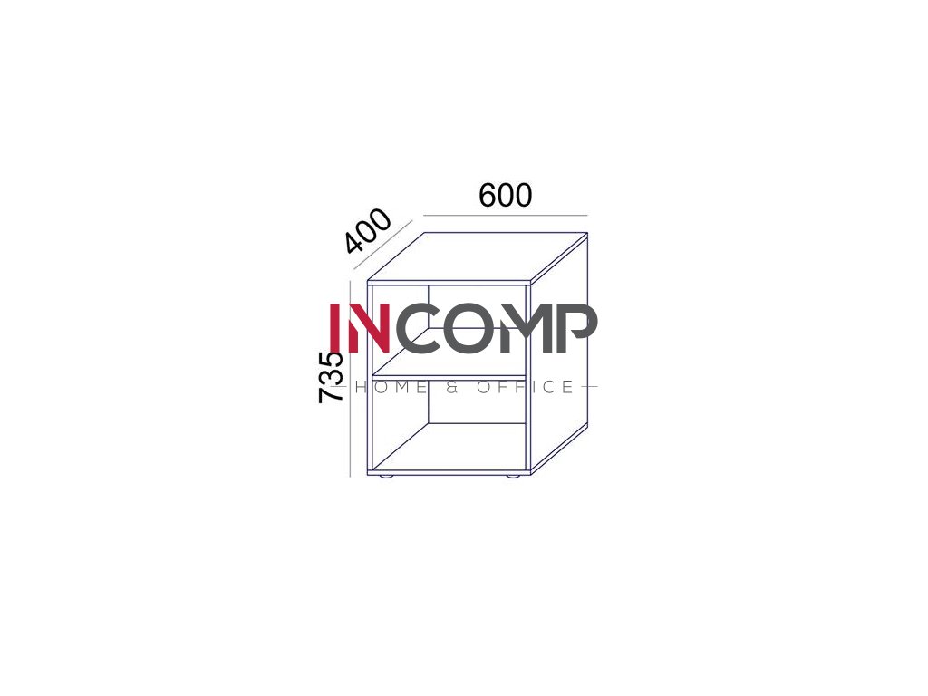 Úložný prvok má výšku rovnakú ako písacie stoly, otvorená s jednou poličkou.