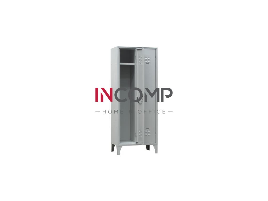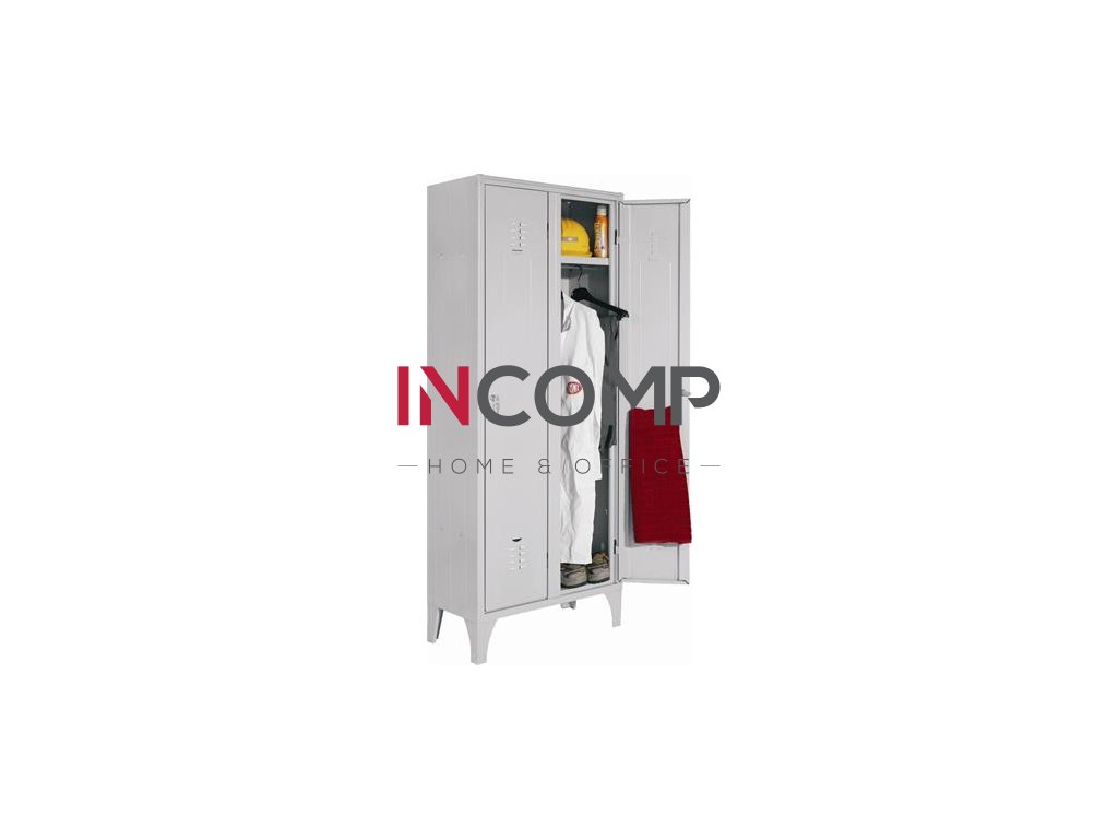oceľová skrinka sivej farby, bezpečnostný zámok s 2 kľúčmi, tyč na vešiaky, s policou jedným vešiakom, držiak na uterák aj dáždnik (UMH4), vetranie je zabezpečené vetrákmi, miesto na štítok, 15 cm nohy alebo plný podstavec, šírka priečinkov: 30 cm
