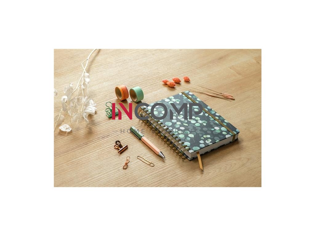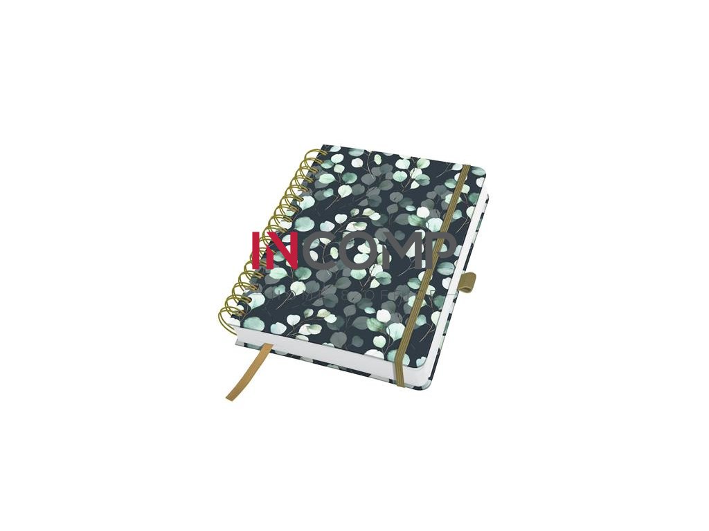 Špirálový zošit s tvrdou obálkou, s motívom eukaliptu -matný motív - zelená špirálová väzba -mikroperforované listy -240 bodkovaných strán -120 g biely papier -vrecko na zadnej stane obalu -70% používaného materiálu s certifikátom FSC -vegánsky produkt
