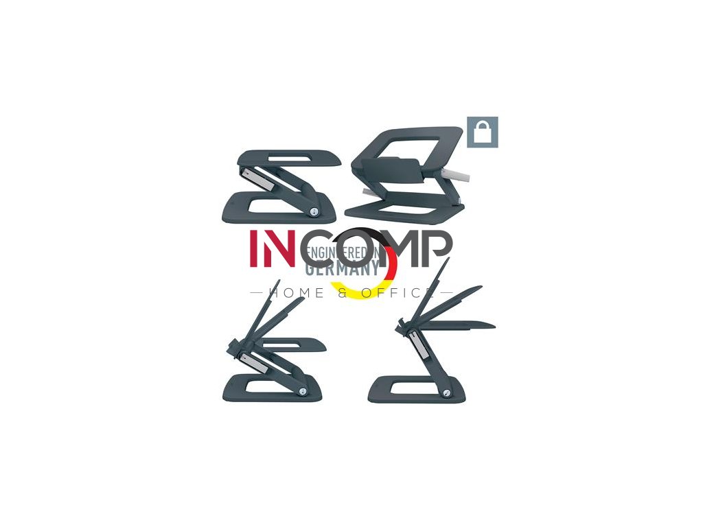Integrovaný háčik umožňuje bezpečný a stabilný úchop, sklopenie háčika pre bezpečné použitie v horizontálnej polohe notebooku alebo pri uložení naplocho, gumové nožičky zabránia kĺzaniu stojana po stole