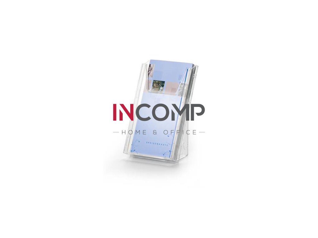 Stojan na prospekty pre dokumenty rozmeru 1/3 A4 alebo A6 v stolovej aj nástennej verzii. -pre vnútorné použitie -ideálne pre informácie na recepciách, showroomoch alebo čakárňach -plast -odolný - na dokumenty 1/3 A4 a A6 (do 210 x 116 mm) -priehľadná -rozšíriteľná - nosnosť: až do 6 kg -kapacita náplne 24mm -1 priehradka - obsah sady: 1 priehradka, 2 nosné prvky, 1 predný panel, 1 tyč -možné použiť ako stojan na stôl alebo ako nástennú verziu -rozmer stolovej verzie: 121 x 198 x 117 mm (Š x V x H) - rozmer nástennej verzie: 121 x 208 x 111 mm (Š x V x H)