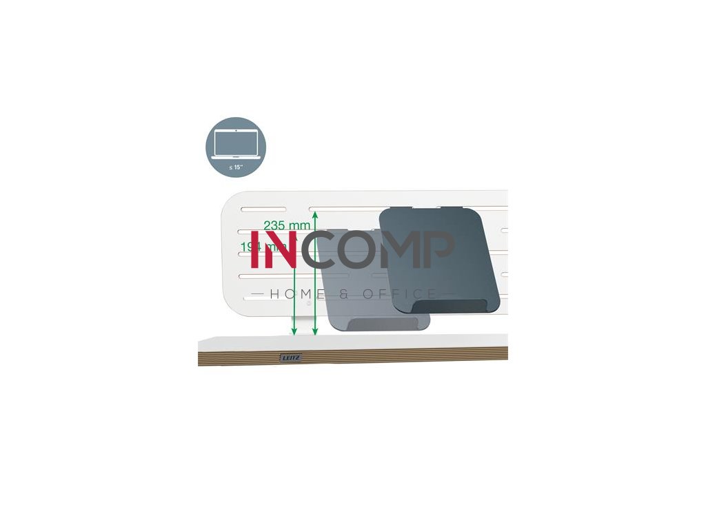 Jedinečný držiak na notebook (až 15" notebook s maximálnou hĺbkou 245 mm) sa jednoducho zasunie do pegboardu a zdvihne obrazovku notebooku do perfektnej ergonomickej úrovne pomocou 2 nastavení výšky (194 alebo 235 mm); zvyšuje pohodlie a pomáha chrániť krk či chrbát pred bolesťou pri práci posediačky alebo postojačky, má pozitívny dopad na pohodu