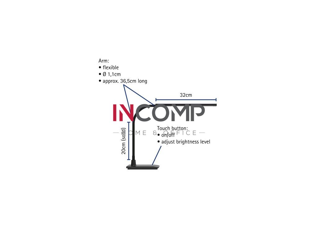 Energeticky úsporná stolová lampa vyrobená najnovšou technológiou LED. Ovládanie jasu, ktoré možno prispôsobiť aktivite a individuálnym potrebám. Čistý, decentný dizajn, harmonicky zapadá do priestoru. - svetelný zdroj: vstavaný LED panel, LED žiarovky sú vymeniteľné v tele svietidla - intenzita svetla: 726 lumenov, nastaviteľná v 4 úrovniach - osvetlenie: 1120 luxov vo vzdialenosti 35 cm - so stmievateľným dotykovým spínačom pre zníženie odtieňov - teplota farby: 3000 Kelvinov, teplá biela - priemerná životnosť LED: 50 000 hodín - priemerná spotreba energie: 6 kWh/1000 h - materiál ramena: kov, pogumovaný - materiál hlavy: hliník - dĺžka ramena: 38 cm - dĺžka hlavy: 32 cm - výška: 37,3 cm - hlava a rameno sa dajú naklápať a otáčať - vážený plastový podstavec, rozmer 16,7 cm x 12 cm - dotykový vypínač na podstavci - funguje zo siete 220/240 V - farba: čierna - záruka: 2 roky - hodnotenie energetickej účinnosti: E ??(na stupnici A-G)