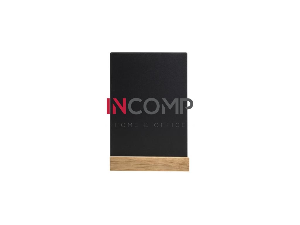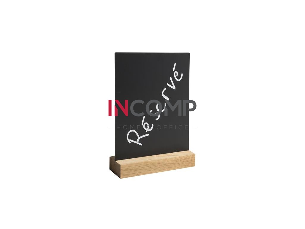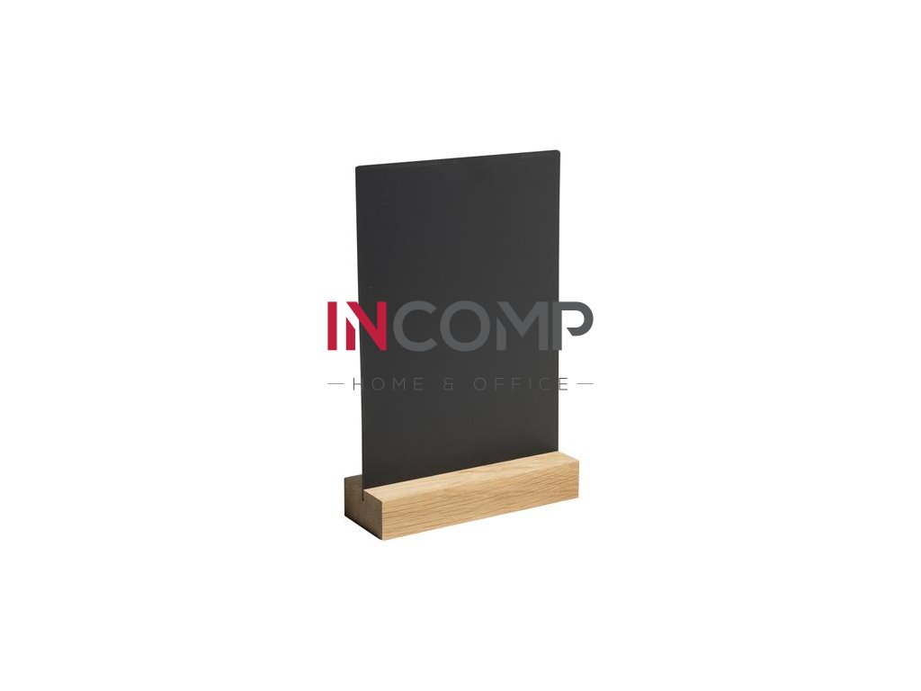 Ideálny na vystavenie jedálnych lístkov, cien či ponúk na stole. -vyrobený z ABS plastu -vhodný na písanie kriedou alebo kriedovým popisovačom -obojstranný -zvislá orientácia -podstavec z dubového dreva -rozmery: 148 x 52 x 210 mm