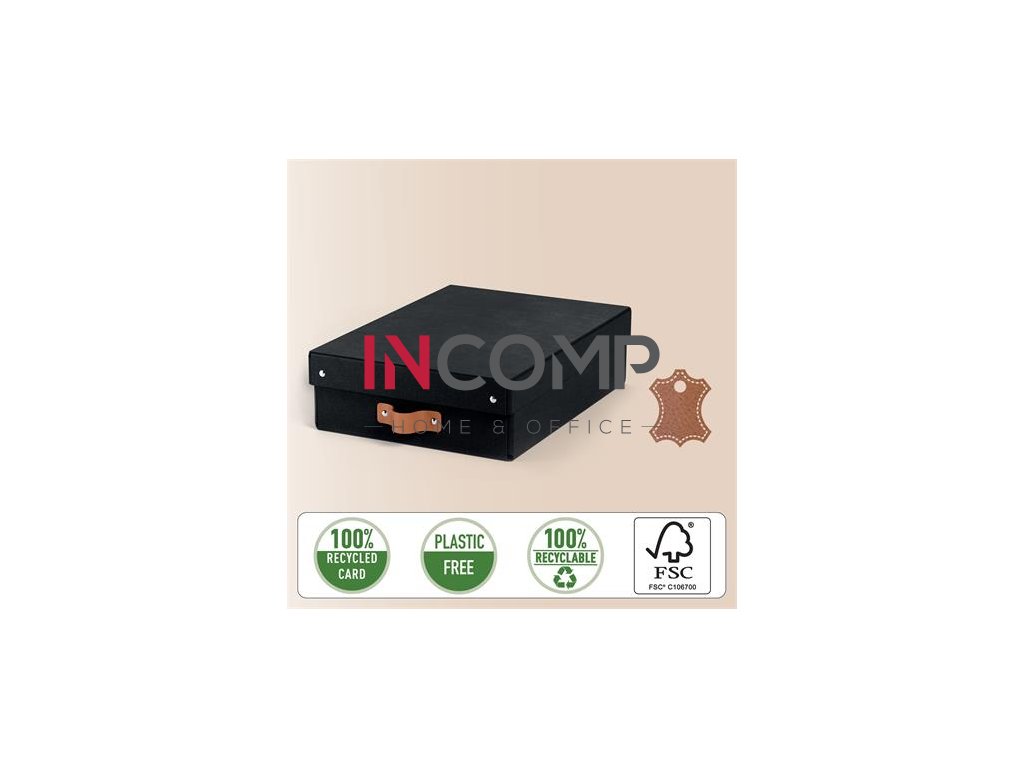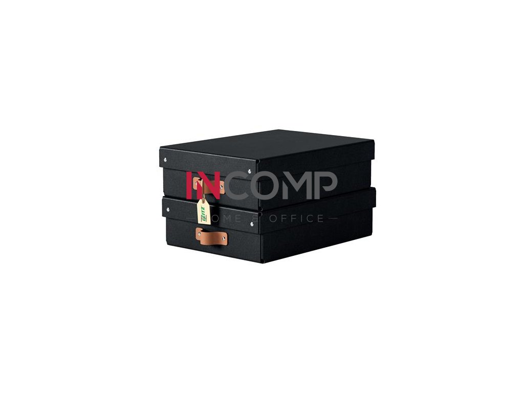 Súprava dvoch stredne veľkých nízkych úložných boxov s vekom vyrobených zo 100% recyklovanej lepenky s certifikátom FSC v modernom a čistom dizajne, ktorý doplní vašu domácnosť aj kanceláriu.