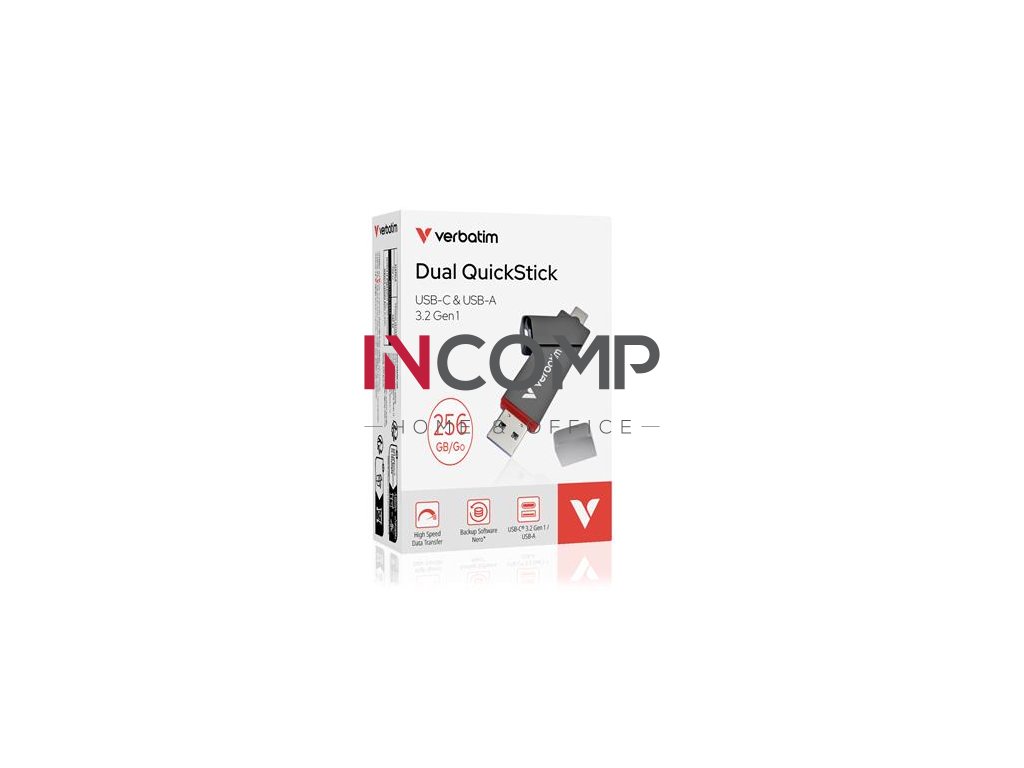 VERBATIM Dual QuickStick ponúka rýchlosť a výkon SSD v kompaktnej podobe USB disku. Jeho konštrukcia s dvoma rozhraniami, ktorá je vybavená konektormi USB-A i USB-C, zabezpečuje bezproblémovú kompatibilitu s rôznymi zariadeniami, od starších notebookov až po najnovšie smartfóny a tablety.-kompaktné, robustné a odolné prevedenie -rýchle a praktické úložné riešenie pre každodenné používanie - balenie obsahuje aj software pre zálohovovanie Nero (je kompatibilný iba s OS Windows) Požiadavky na systém: Windows 11, 10, 8 Mac OS X 14 alebo vyššie, Android 4.0 alebo vyššie Technické dáta -napájanie: USB-port -USB pripojenie: USB-A / USB-C -rozhranie: USB 3.2 Gen 1 -formát: M.2 -rýchlosť čítania: až 530 MB/s -rýchlosť zápisu: až 470 MB/s -materiál puzdra: zliatina zinku -hmotnosť: cca. 32 g -rozmery: 81,5 mm x 18 mm x 10,8 mm (D × Š × V) -prevádzková teplota: 0° – 40° C -teplota skladovania: -20°C – 70°C obsah balenia: Verbatim Dual QuickStick USB-C/USB-A Flash Drive Nero Backup softver (nie je kompatibilný s OS Mac), manuál
