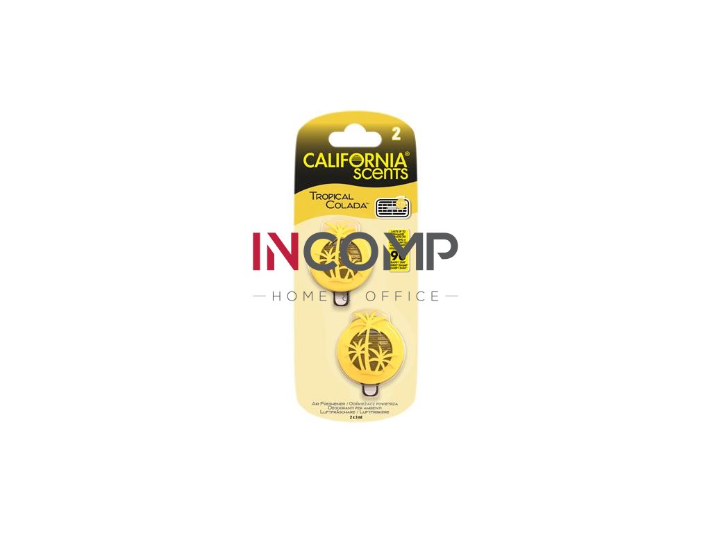 California Scents Mini Diffuser - Tropical Colada s vôňou populárneho miešaného nápoja Pina Colada, ktorý rozvonia interiér vášho auta až na 90 dní. Difúzor je vhodný na umiestenie do väčšiny mriežok výduchov vetrania vozidiel.