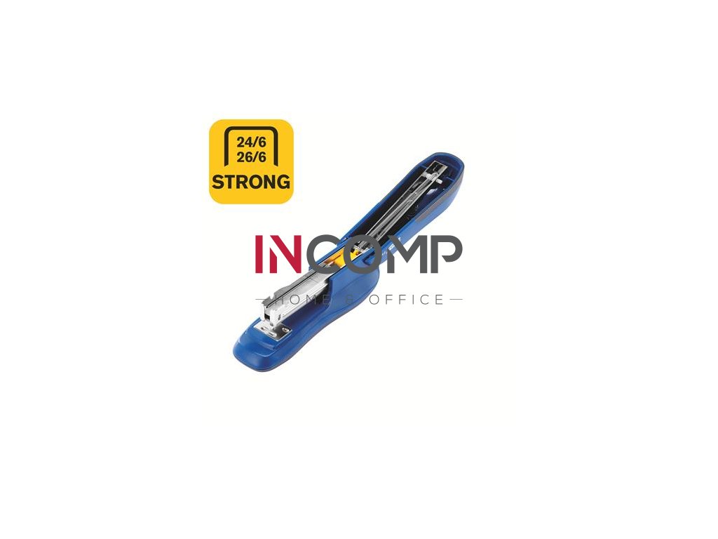 Zošívačka s polovičným plnením spiniek, oceľovým mechanizmom, kvalitným plastom ABS a gumou TPE. Módny ergonomický dizajn. Vhodná pre domácnosť aj kanceláriu.
