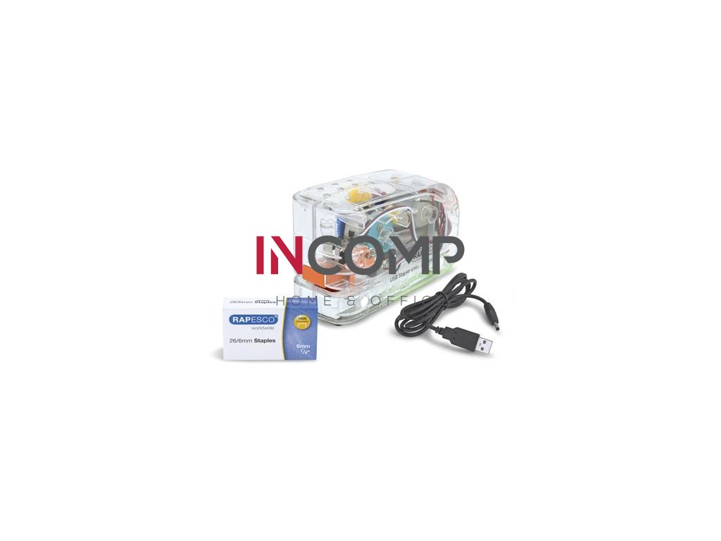 Zošívačka, 26/6, 15 listov, elektrická, s USB nabíjačkou, RAPESCO "626EL", priehľadná